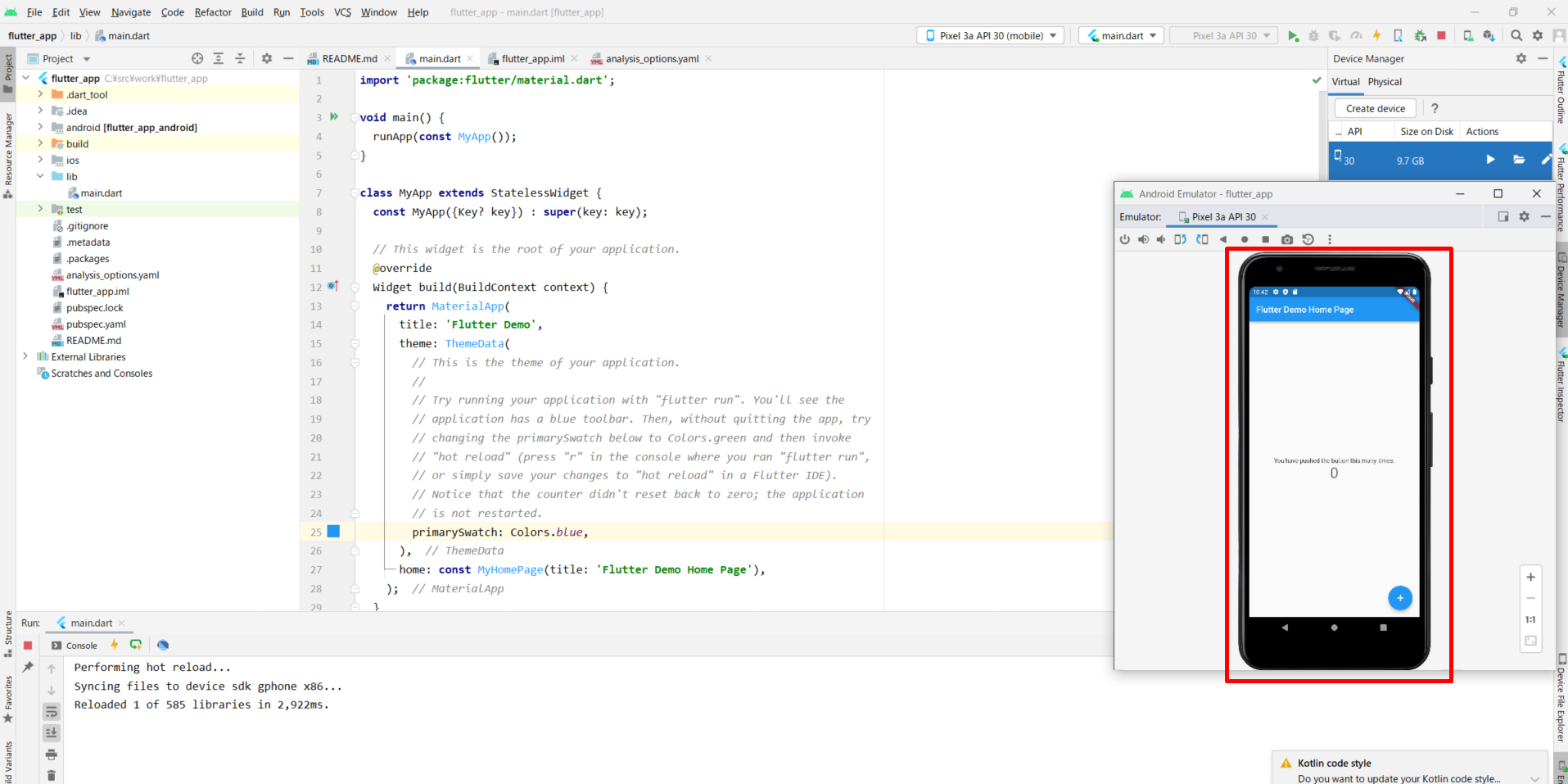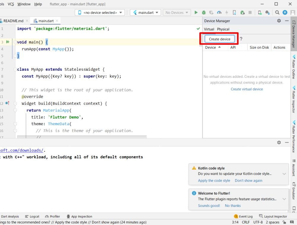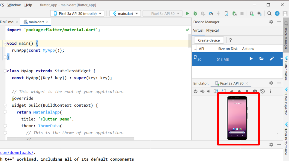 그러면 오른쪽에 플러터 프로젝트가 뜨는 것을 확인할 수가 있다