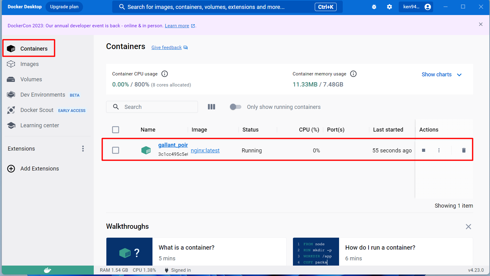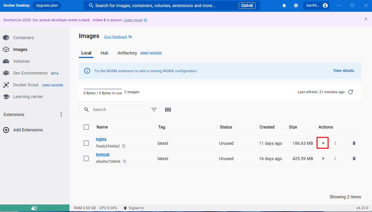 위와 같이 Containers를 확인해 보면 nginx가 실행 중인 것을 확인할 수 있다