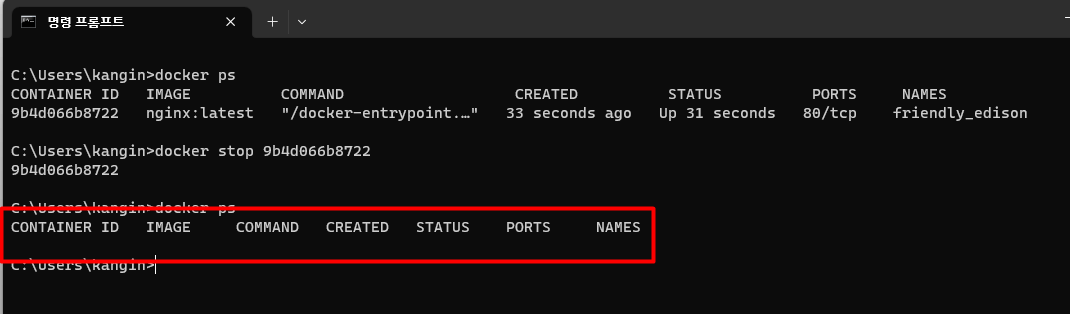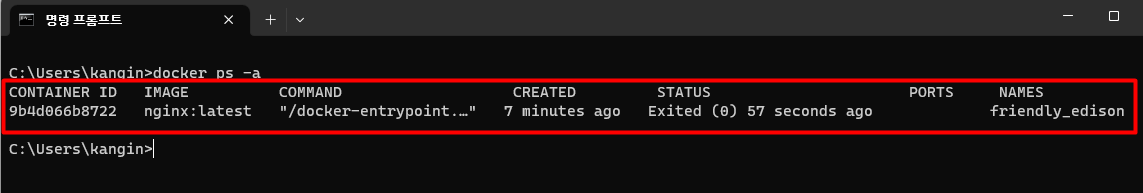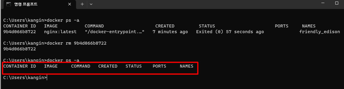 삭제를 한 뒤에 docker ps -a를 해보면 컨터이너가 사라진 것을 알 수 있다