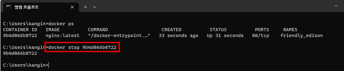 방금 실행시킨 nginx의 CONTAINER ID는 9b4d066b8722이기 때문에 아래와 같이 입력해 보았다