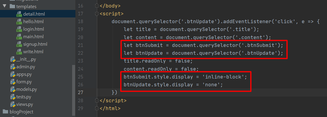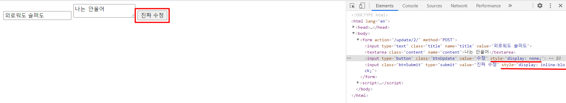 일단 class명 btnSubmit과 btnUpdate를 찾아서 display를 바꿔준다