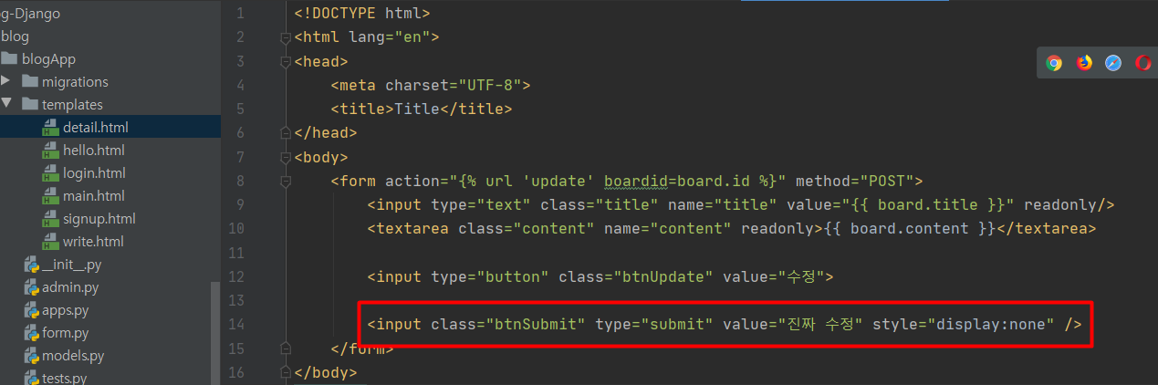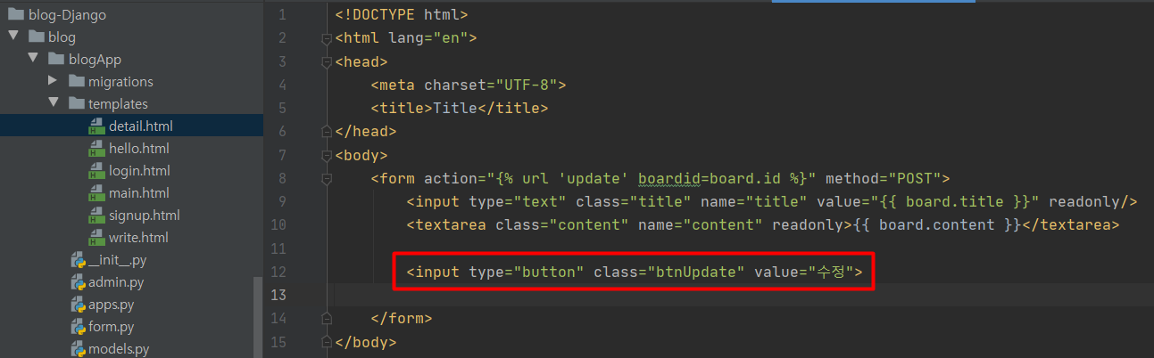 그다음, 수정을 눌렀을때 form으로 전송해서 Update를 해야한다