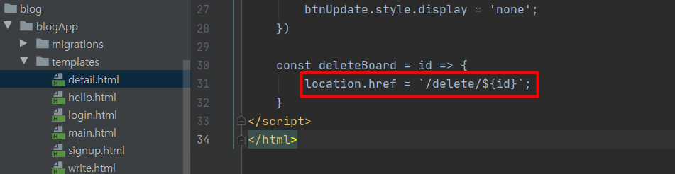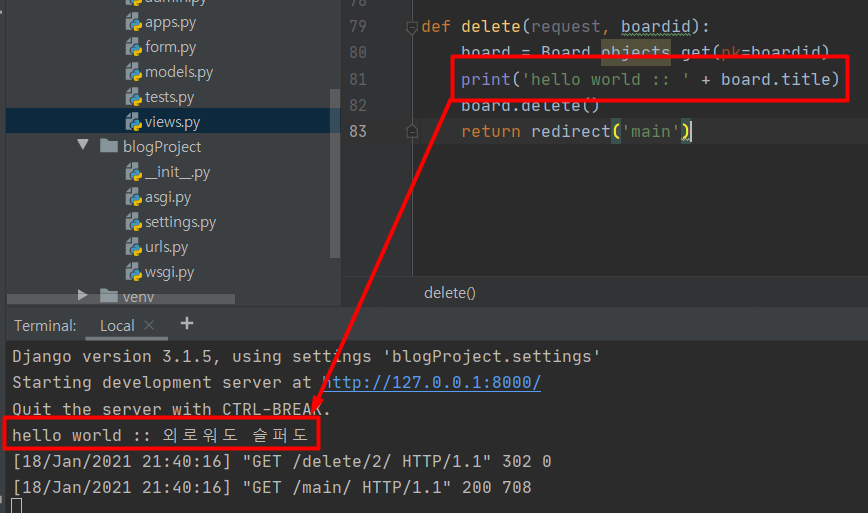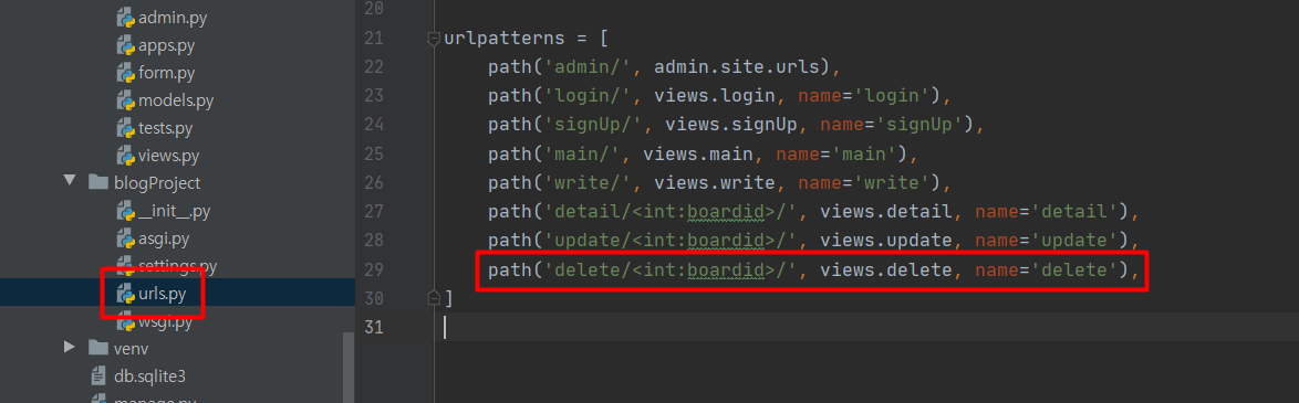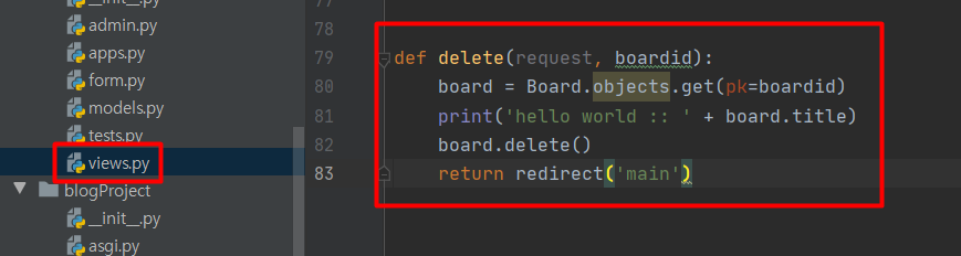 늘 그래왔듯이 path를 만들어줬으면 views의 delete 함수도 하나 선언해 주자