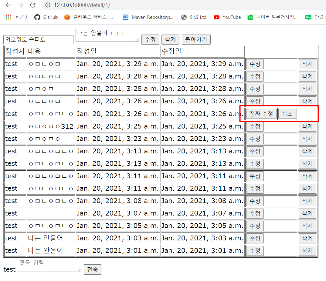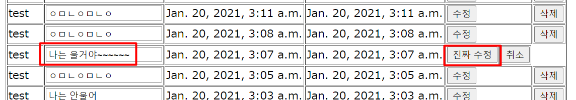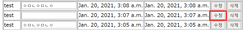 이렇게 까지만 하면 【수정】 버튼을 눌러보았을 때, 【진짜 수정】 버튼과, 【삭제】 버튼이 생겨날 것이다