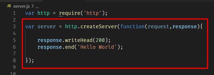 위 코드에는 createServer를 해서 서버를 만드는 것까지만 하였다. 그만 든 것을 server라는 변수 안에 담았다