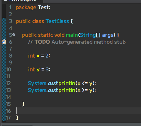 = 라는 것은 이미 약속된 단어로 인식이 된다. 무슨 약속?이라고 할 수 있는데, 이미 변수 선언할 때 = 을 쓰기 때문에, 크기 비교할 때는 사용할 수가 없다