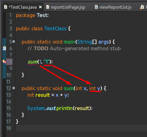 "1" 은 정수가 아니기 때문에, 에러를 발생한다. 그러므로 메소드에 값을 넘겨줄 때