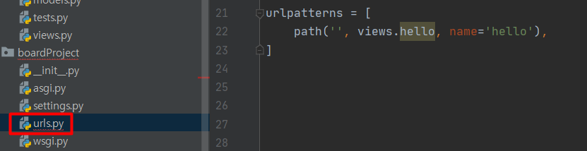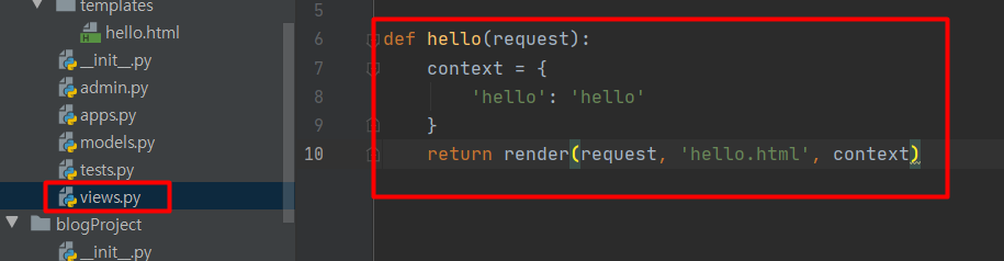 위에 views.hello 이니까 views.py파일을 열어서 hello라는 함수를 생성한다