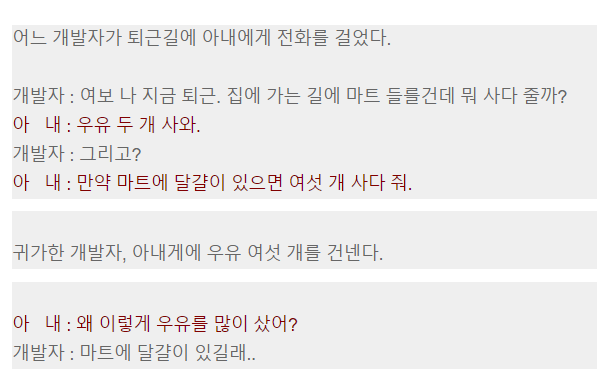 그다음은 아내가 만약 달걀이 있으면 6개를 달라고 사달라고 하였다.