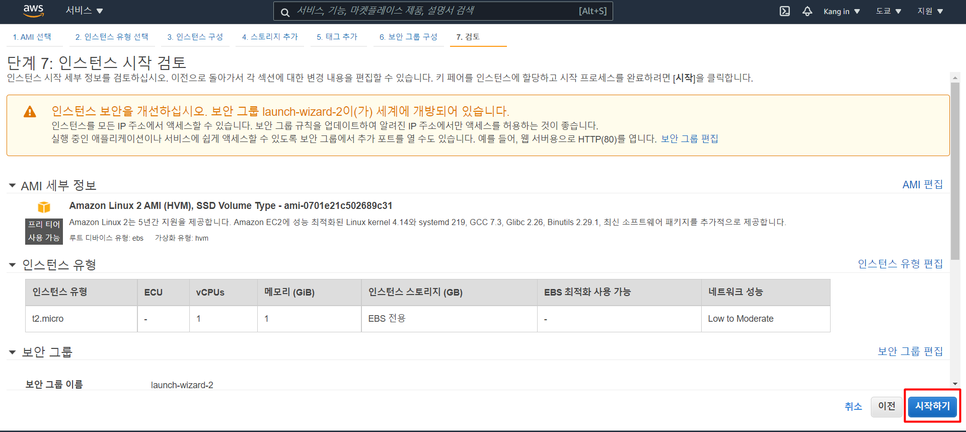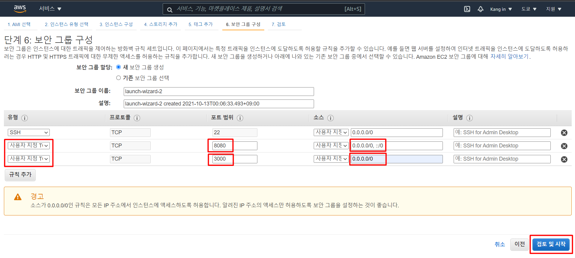 모든 사용자가 웹으로 접근할 수 있도록 0.0.0.0/0으로 맞춰주고 【검토 및 시작】을 클릭한다