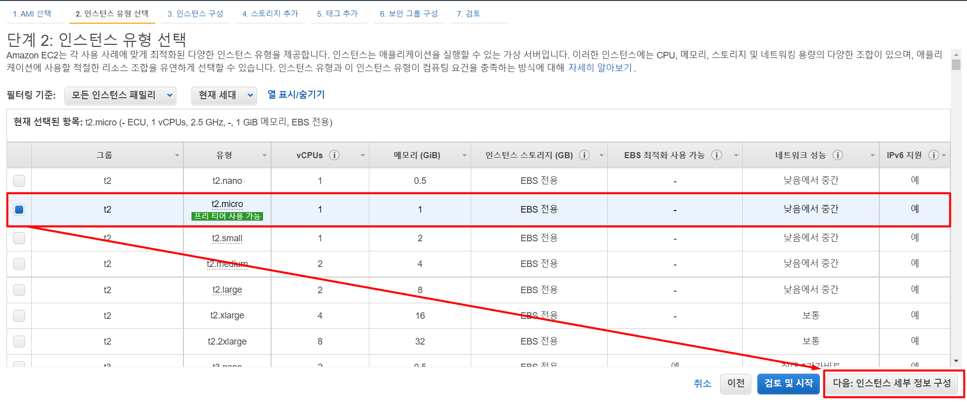 성능을 선택하는 화면이다. 프리티어를 선택하면 무료로 이용할 수 있다 ( 회원가입 후 1년간 사용 가능 )