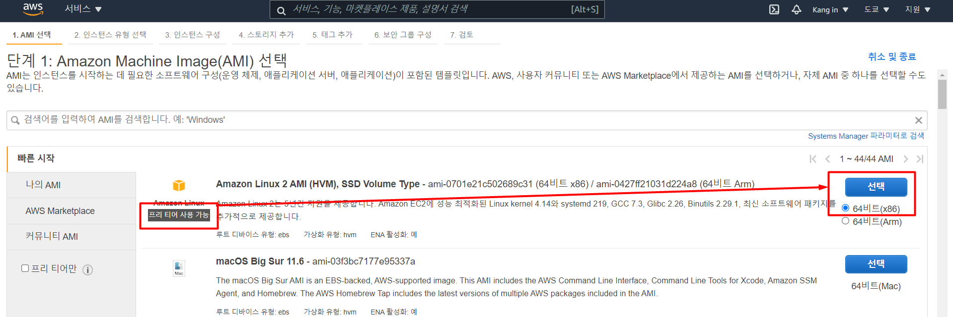 프리 티어 사용 가능이라고 적혀있는 OS를 선택한다