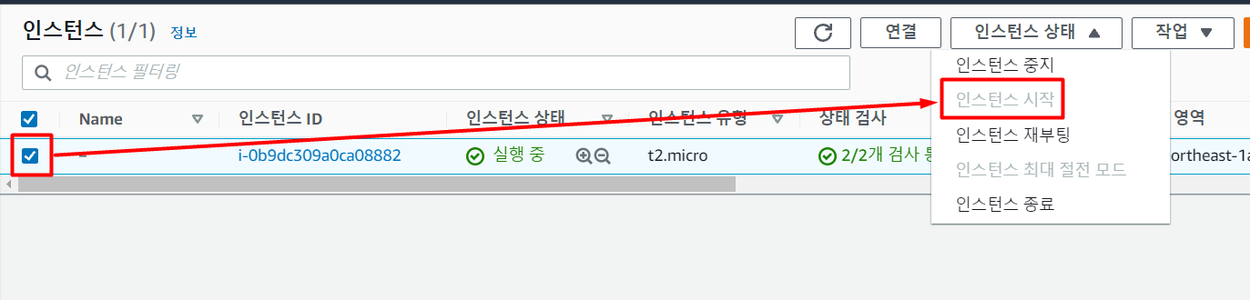 저번 시간에서 인스턴스를 중지를 하지 않았다면 3번부터 시작하고, 중지를 하였다면 아래와 같이 한다