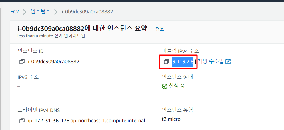 인스턴스를 중지하고 다시 시작하면 【퍼블릭 IPv4주소】가 바뀌기 때문에 다시 시작할 때마다 봐줘야 한다