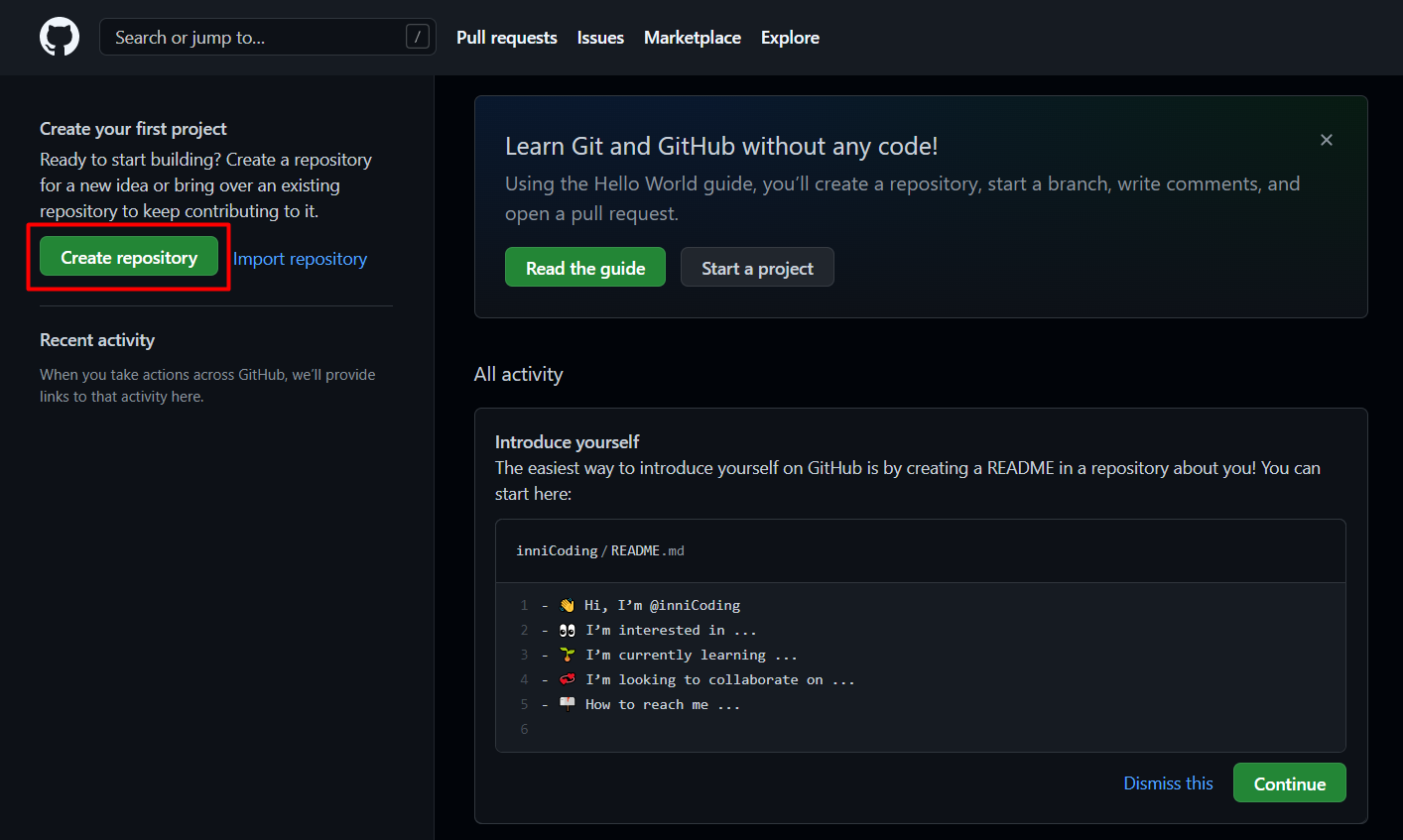 맨 처음, Git hub에 로그인을 하면 위와 같은 화면이 뜨게 될 것이다